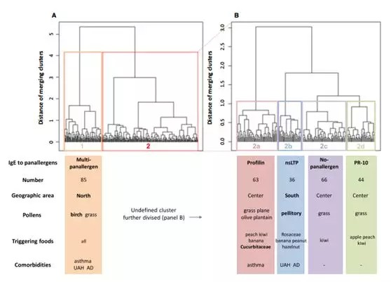 Results: PFS was observed in 300/1271 children (24%). Cluster analysis identified five PFS endotypes linked to panallergen IgE sensitization: (i) cosensitization to≥2 panallergens (‘multi-panallergen PFS’); (ii–iv) sensitization to either profilin,or nsLTP, or PR-10 (‘mono-panallergen PFS’); (v) no sensitization to panallergens (‘no-panallergen PFS’). These endotypes showed peculiar characteristics: (i)‘multi-panallergen PFS’: severe disease with frequent allergic comorbidities and multiple offending foods; (ii) ‘profilin PFS’: oral allergy syndrome (OAS) triggered by Cucurbitaceae; (iii) ‘LTP PFS’: living in Southern Italy, OAS triggered by hazelnut and peanut; (iv) ‘PR-10 PFS’: OAS triggered by Rosaceae; and (v) ‘no-panallergen PFS’: mild disease and OAS triggered by kiwifruit.