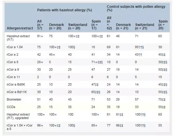 ?、賹﹂蛔拥氖澄镞^敏同時伴或不伴花粉過敏。②我們試圖在西班牙、瑞士和丹麥三個國家中評估一組榛子過敏原,用于榛子過敏的診斷。③52例對榛子雙盲、安慰劑對照食物挑戰(zhàn)試驗結(jié)果呈陽性的患者;5例有過敏反應史;花粉過敏但榛子耐受62例;63例非特應性受試者作為對照。采用ImmunoCAP法對榛子提取物、重組榛子過敏原(rCor a 1.04、rCor a 2、rCor a 8、rCor a 11)、天然過敏原(nCor a 9、nCor a Bd8K、nCor a Bd11K)的血清特異性IgE水平進行分析。④榛子過敏患者中,91%(瑞士/西班牙,100%;丹麥,75%)有對榛子提取物,75%對rCor a1.04, 42%對rCor a2, 28%對rCor a8, 2%對rCor a11的特異性IgE。對Cor a 1.04的致敏率最高的是北部地區(qū)(瑞士/丹麥,100%;西班牙,18%),而對脂質(zhì)轉(zhuǎn)移蛋白rCor a8的IgE在西班牙占優(yōu)勢(西班牙,71%;瑞士,15%;丹麥,5%)。對抑制蛋白 rCor a2的IgE分布均勻(40% ~ 45%)。在花粉過敏的對照組中,61%的人有對榛子提取物, 69%的人對rCor a 1.04, 34%的人對rCor a 2, 10%的人對rCor a 8, 6%的人對rCor a 11的特異性IgE。
