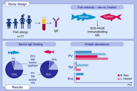Results: Raw and heated extracts from catfish displayed a higher frequency of IgE-binding compared to those from salmon (77% vs 70% and 64% vs 53%, respectively). The major fish allergen parvalbumin demonstrated the highest IgE-binding capacity (10%-49%), followed by triosephosphate isomerase (TPI; 19%-34%) in raw and tropomyosin (6%-32%) in heated extracts. Six previously unidentified fish allergens, including TPI, were registered with the WHO/IUIS. Creatine kinase from salmon and catfish was detected by IgE from 14% and 10% of patients, respectively. Catfish L-lactate dehydrogenase, glyceraldehyde-3-phosphate dehydrogenase, pyruvate kinase, and glucose-6-phosphate isomerase showed IgE-binding for 6%-13% of patients. In salmon, these proteins could not be separated successfully.