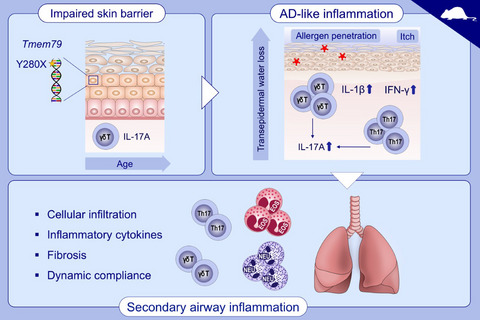 Results: Tmem79ma/ma mice developed IL-17A-dependent spontaneous AD-like inflammation and were refractory to S aureus infection. Mutant mice progressed to airway inflammation subsequent to the occurrence of dermatitis. The progression from skin to lung disease is dependent on adaptive immunity and is facilitated by cutaneous expansion of Th17 and TCRγδ T cells.