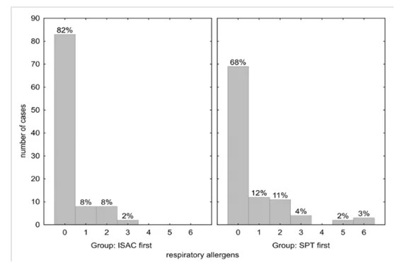 In the ISAC-first procedure significantly less SPTs were performed during allergy diagnosis (median 4 vs. 14). By SPT in 19% of patients in the ISAC-first group and in 34% in the SPT-first group additional respiratory allergens (p?=?0.014) were detected not positive in ISAC microarray. By ISAC microarray test 18% additional sensitizations were found in the ISAC-first, and 32% in SPT-first cohort (p?=?0.016). For food allergens 13 and 12% additional sensitizations were detected by the microarray not detected by SPT in the two groups (p?=?0.800). No additional food allergen was found by SPT in the ISAC-first group, while in 6% of the cases in the SPT-first group detected sensitizations were negative in the microarray.