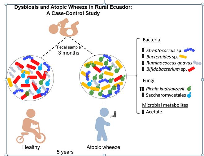 As previously observed in Canadian infants, microbial dysbiosis at 3 months of age was associated with later development of atopic wheeze. However, the dysbiosis in Ecuadorian babies involved different bacterial taxa, was more pronounced, and also involved several fungal taxa. Predicted metagenomic analysis emphasized significant dysbiosis-associated differences in genes involved in carbohydrate and taurine metabolism. Levels of the fecal short-chain fatty acids acetate and caproate were reduced and increased, respectively, in the 3-month stool samples of children who went on to have atopic wheeze