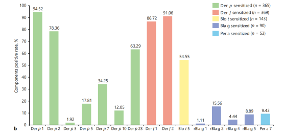 Conclusion: Epidemiological data on allergen components causing allergic symptoms can be further understood using CRD. Der p 1, Der p 2, Der p 23, Der f 1, Der f 2 as the primary sensitizing component of the study cohort. The positive rate for Blo t 5 was 28.01% for all populations and 54.45% for Blo t-positive samples. In addition, CRD allows us to identify more potential allergen associations such as common sensitivities and cross-reactions between component proteins. Based on these results, we suggest that when patients are identified as sensitized to a particular allergen, clinicians can pay more attention to other allergy components that are closely related to it.