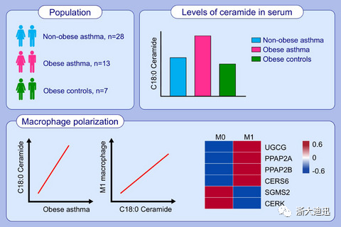 Results: The obese asthma had higher levels of serum C18:0 and C20:0 ceramides than the nonobese asthma group (P = .028 and P = .040, respectively). The value of the serum C18:0 ceramide (184.3 ng/mL) for discriminating the obese asthma from the non-obese asthma group showed 53.9% sensitivity and 85.7% specificity (AUC?=?0.721, P?=?.024). The microarray data showed significantly increased ceramide synthesis and metabolic shift to ceramide accumulation during M1 macrophage polarization in humans. Increased airway hyperresponsiveness, M1 macrophage polarization, and C18:0 ceramide levels were noted in obese mice, but not in non-obese mice. Increased expression of ceramide synthase (CerS) 1 and CerS6 (not CerS2) was noted in lung tissues of obese mice.